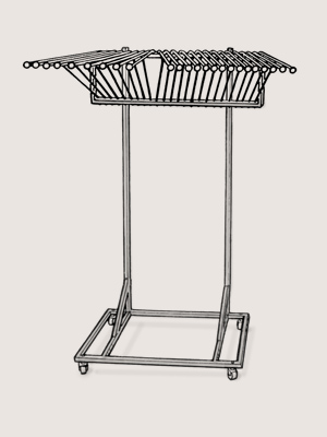 Une vitrine métallique compacte avec bras pivotants et roulettes, conçue pour faciliter à la fois la mobilité et la présentation d’un grand nombre d’échantillons dans un petit espace.